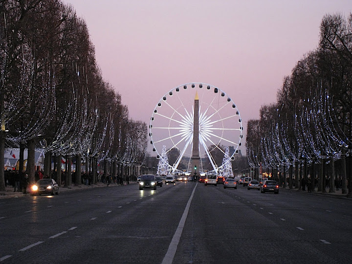 Champs-Élysées turned into a marché de Noël (Christmas market) just east of Grand Palais, The Christmas market in Karlsruhe ended on the night of Dec. 23; stalls were dismantled and there was absolutely no trace of the market's aftermath by the early hours of Dec. 24. Not so in Paris. There were still stalls selling merchandises and food on both sides of the famous avenue 2 days after Christmas! But the atmosphere was inferior to the Christmas markets we had visited in Germany. There were no people hanging around, or chatting with friends while enjoying a mug of vin chaud (hot wine; glühwein in German). There was just a single file of stalls on each side of the avenue. If the Germans were to run this Christmas market, I am sure that there would be at least two files of stalls on each side of the avenue and ample of standing room next to the hot-wine stalls. To make matter worse, the vin chaud was served in a plastic disposable cup, not an environmentally friendly ceramic mug (but then, not too many people were drinking vin chaud). There was one giant Ferris wheel at the eastern end of the market at Place de la Concorde. This giant wheel complements nicely with the light on the trees lining Champs-Élysées.